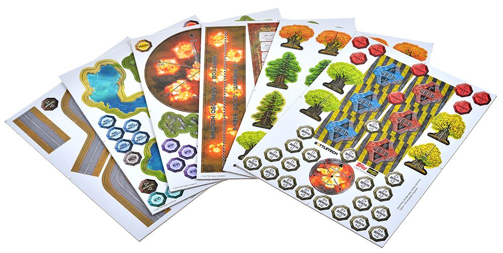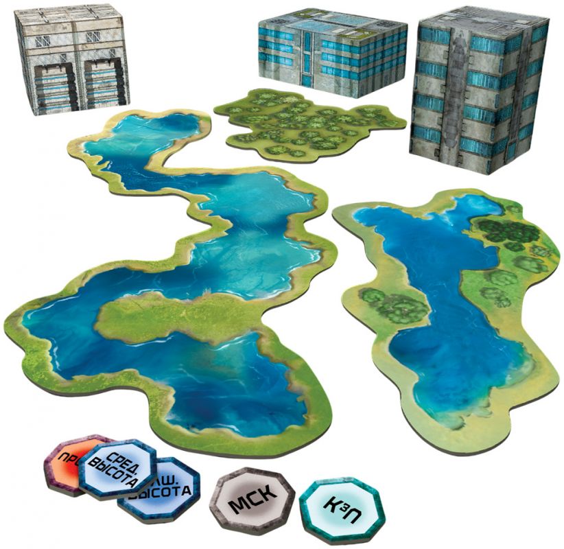Главная ценность коробки — шесть блоков жетонов и двухсторонние элементы ландшафта. Сюда входят дополнительные деревья, жетоны целей и маркеры для расширенных правил движения и местности: реки, дороги, различные типы покрытия и области, влияющие на передвижение и огонь. Такой набор помогает быстро выкладывать на стол новые конфигурации карты, не рисуя их вручную и не полагаясь только на воображение игроков. Разнообразие жетонов позволяет моделировать городские кварталы, лесные массивы, открытые равнины, укреплённые рубежи и сложные «бутылочные горлышки».