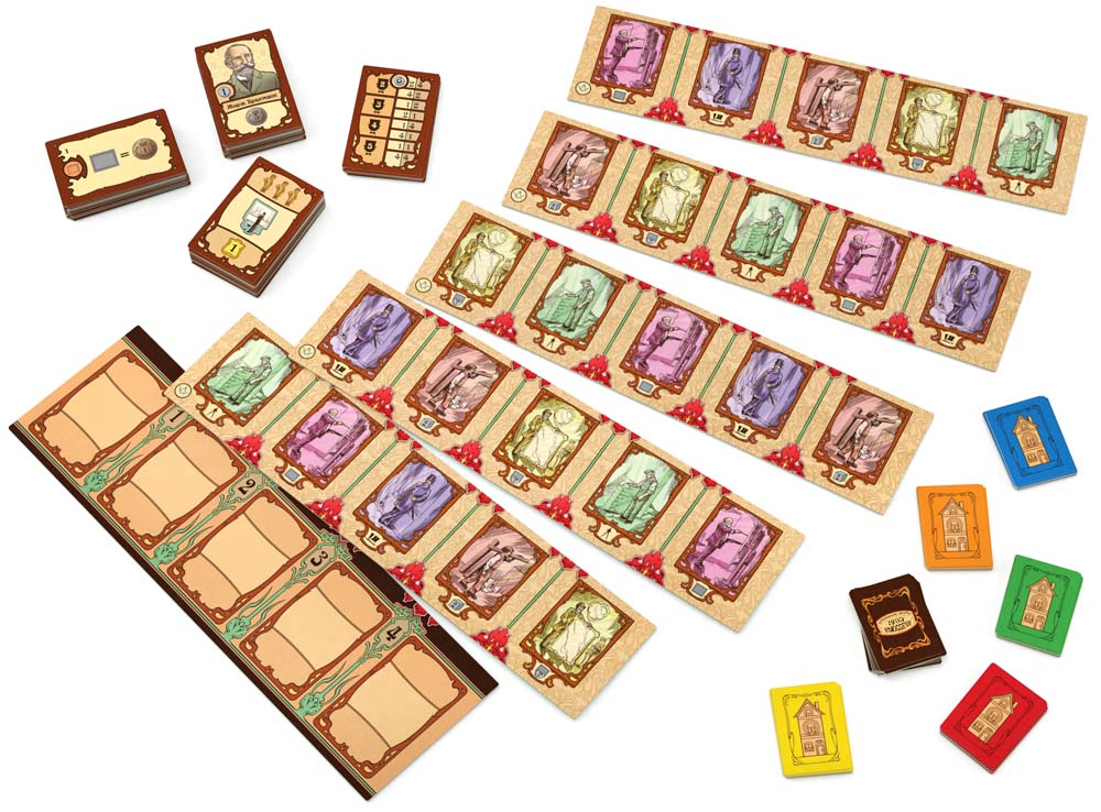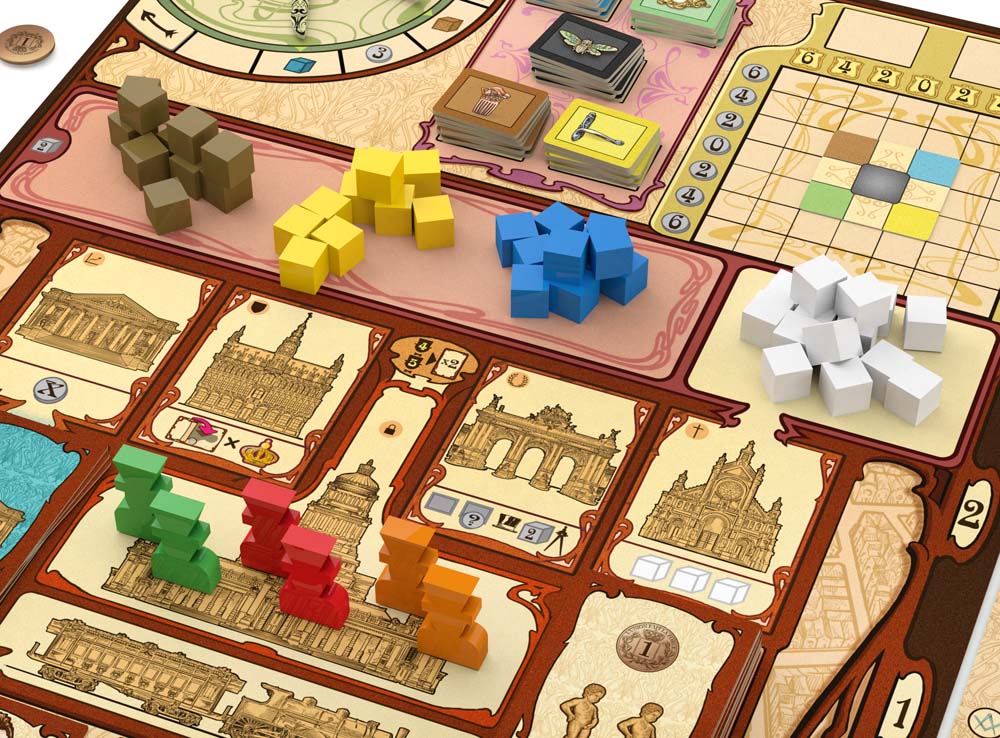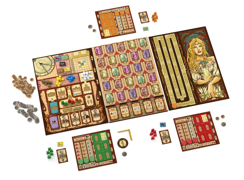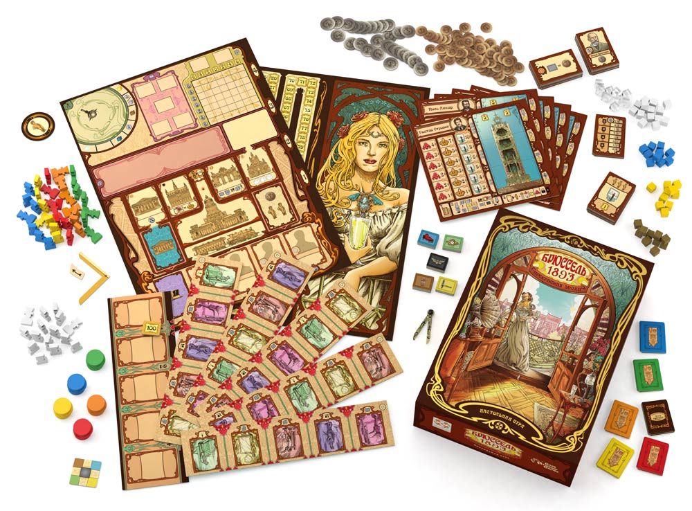 Компоненты подчёркивают художественную тему. В коробке два двухсторонних игровых поля, составное двухстороннее поле, 5 планшетов игроков, 106 карт, жетоны зданий и произведений искусства, жетоны «Прекрасной эпохи», монеты и множество деревянных и пластиковых элементов, отвечающих за ресурсы, рабочих и маркеры. Иллюстрации и оформление помогают погрузиться в атмосферу Брюсселя конца XIX века, где каждый дом – потенциальный шедевр.