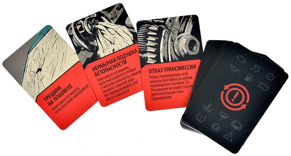 Отдельным слоем усложнения выступают 21 карта продолжительных эффектов. Если многие события в гонке раньше носили разовый характер — произошёл бросок кубика, случилось столкновение, и всё — то с этим дополнением на трассе появляются эффекты, которые действуют не один ход. Такие карты могут задавать долгосрочные изменения условий, усиливать угрозы определённых участков или создавать фоновую напряжённость, с которой нужно считаться постоянно. Продолжительные эффекты добавляют в игру стратегический элемент: важно не только пережить текущий момент, но и правильно спланировать свои действия с учётом того, как долго продлятся новые правила.