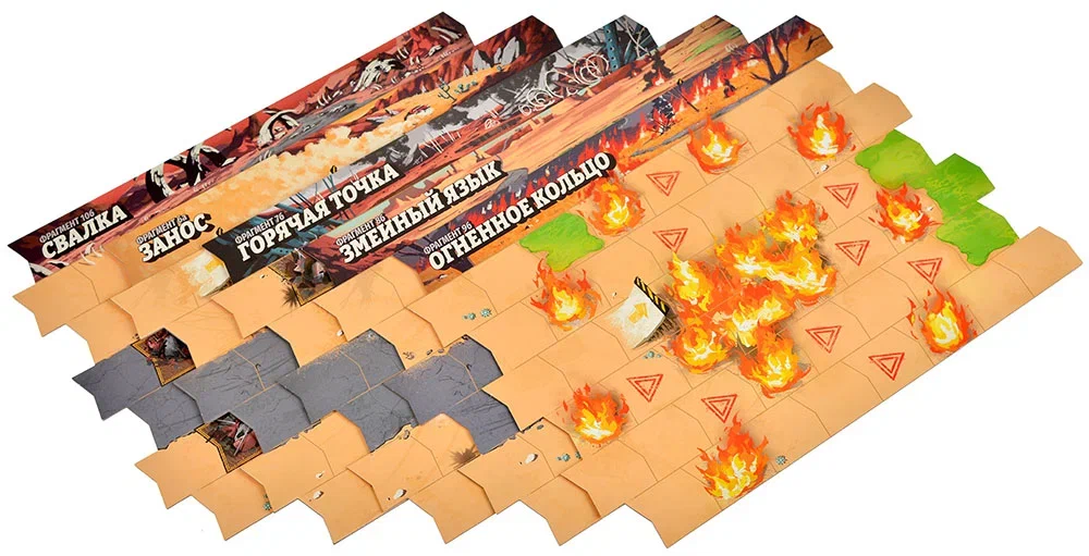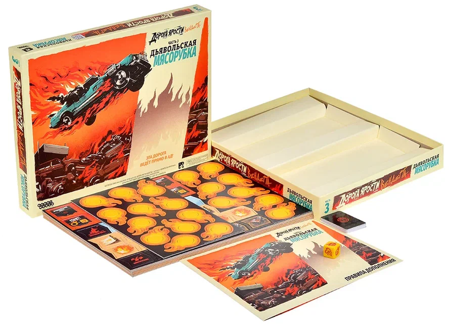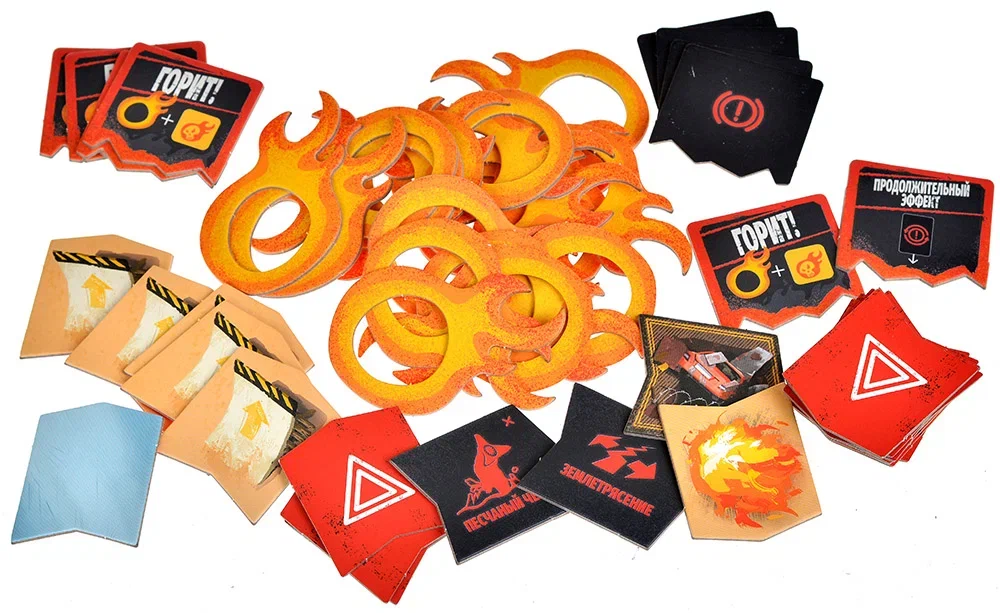 Особая тема дополнения — огонь. В составе вы найдёте 20 жетонов «Горит!» и специальный кубик огня. Пламя становится одним из главных символов «Дьявольской мясорубки», превращая отдельные участки трассы в настоящие зоны ада. Огонь может распространяться, создавая новые опасные локации, или усиливать уже существующие угрозы. Кубик огня отвечает за случайный характер этого процесса: никто не знает заранее, где именно пламя разгорится сильнее, а где ослабнет. Это усиливает ощущение хаоса и заставляет игроков принимать рискованные решения, рассчитывая, удастся ли проскочить через огненный участок вовремя.