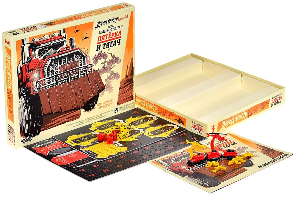 «Дорога ярости: Вендетта. Великолепная пятёрка и тягач» — дополнение к постапокалиптической гонке на выживание «Дорога ярости: Вендетта», которое добавляет в игру ещё больше безумия, скорости и контактного хаоса. В базовой игре игроки управляют бандами головорезов, мчащихся по смертельно опасной трассе, где разрешено толкаться, стрелять и устраивать засады, лишь бы довести хотя бы одну машину до финиша. Это дополнение подбрасывает в топку два новых ярких элемента: массивный автопоезд и отчаянную банду мотоциклистов, что заметно разнообразит партии и добавляет новые тактические возможности.