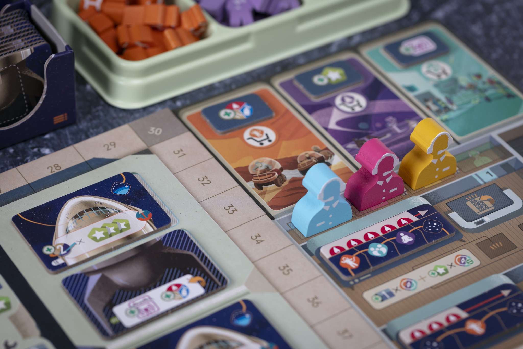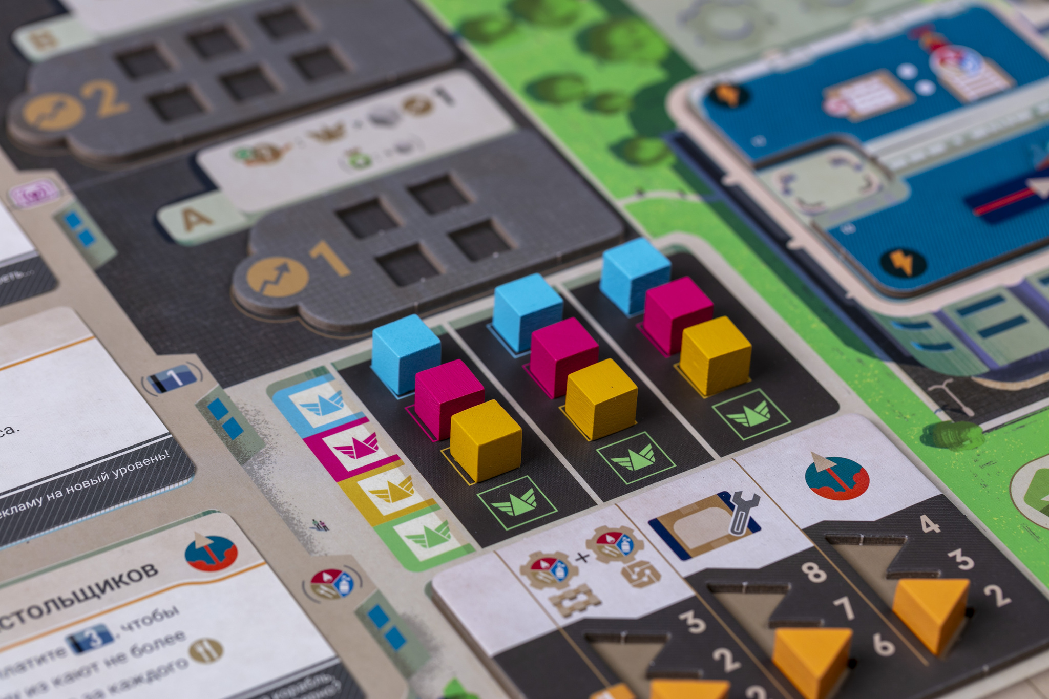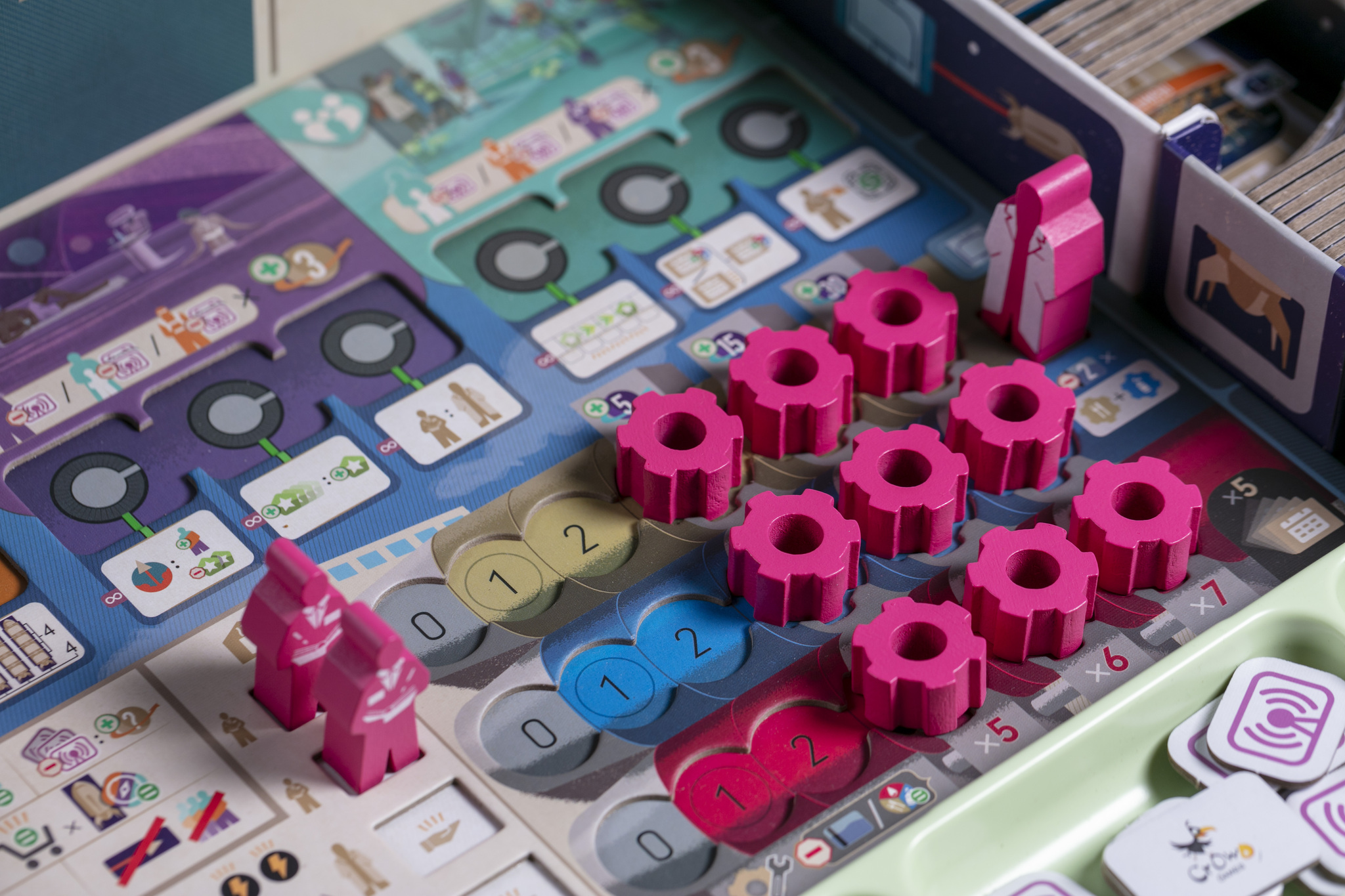 Важная часть игры — установление связей между отделами, где вы выполняете действия. Эти связи делают вас более гибкими: позволяют выполнять действия дешевле и в нужных вам сочетаниях, недоступных с начала игры. Не менее значима динамика рынка ресурсов, который изменяется в зависимости от решений всех игроков.