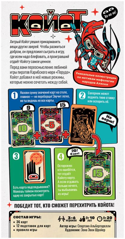«Койот» – быстрая игра на блеф и ставки, в которой вы всегда видите карты других игроков, но никогда не видите собственную. Хитрый Койот предложил зверям сыграть в опасную игру: тот, кто ошибётся в оценке общей суммы карт, отдаёт ему одну из своих ценностей, а без карт из партии выбывает.​