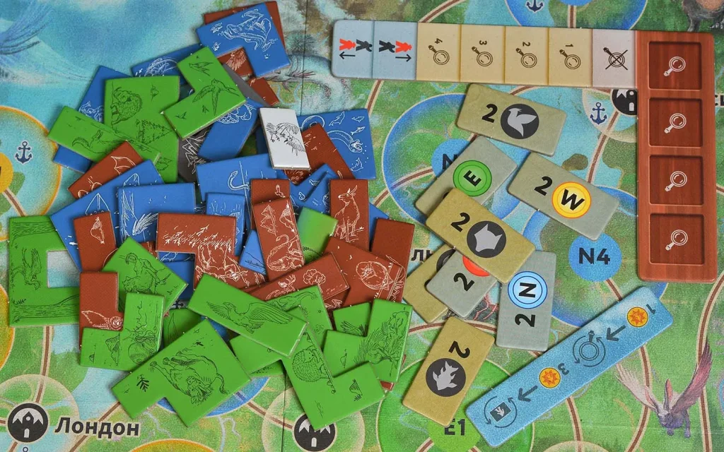 Отдельный пласт геймплея – заповедник. Это отдельное поле, куда вы переселяете пойманных криптидов, выкладывая тайлы местности и тайлы существ, и стремитесь занять выгодные позиции. Всего в коробке 51 тайл местности и 43 тайла криптидов, что даёт огромный простор для комбинирования. Важно не только привезти существ, но и грамотно разместить их в заповеднике: за большинство фишек определённых типов и удачно собранные группы начисляется дополнительная репутация. Игра заканчивается, когда заповедник перестаёт вмещать новые тайлы – тогда доигрывается текущий круг, затем добавляется финальный раунд.