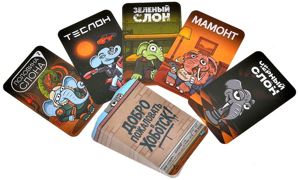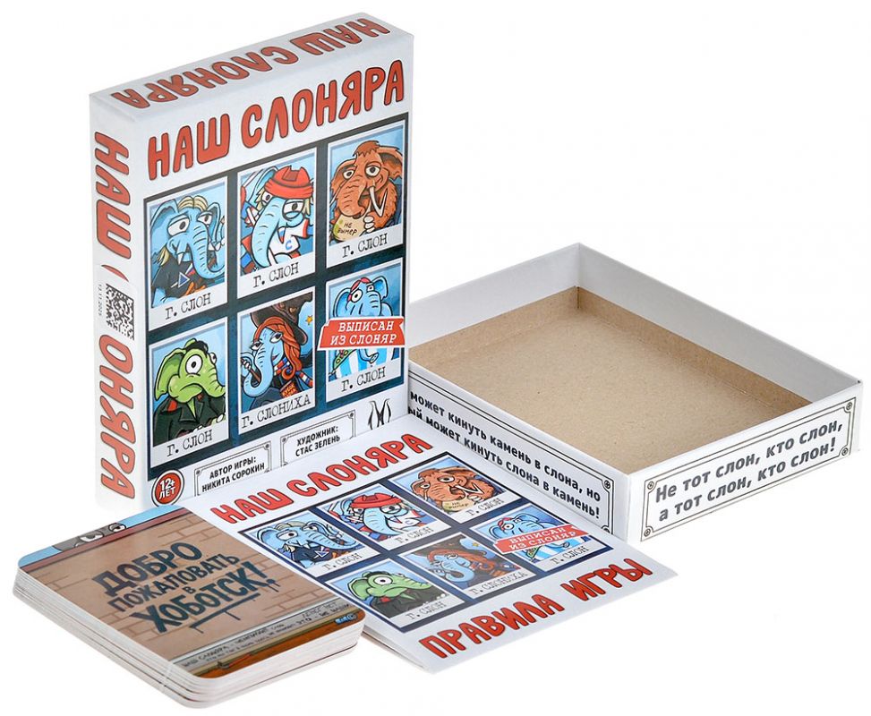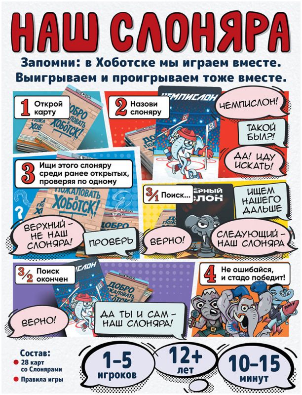 В коробке вас ждут 28 карт со Слонярами с яркими иллюстрациями и именами, которые можно запоминать или придумывать свои. Игровой процесс строится вокруг запоминания порядка карт и командного поиска совпадений, а атмосфера держится на добром юморе и постоянных репликах: «Это наш Слоняра или не наш?».