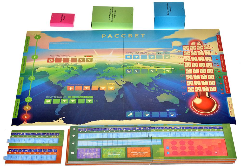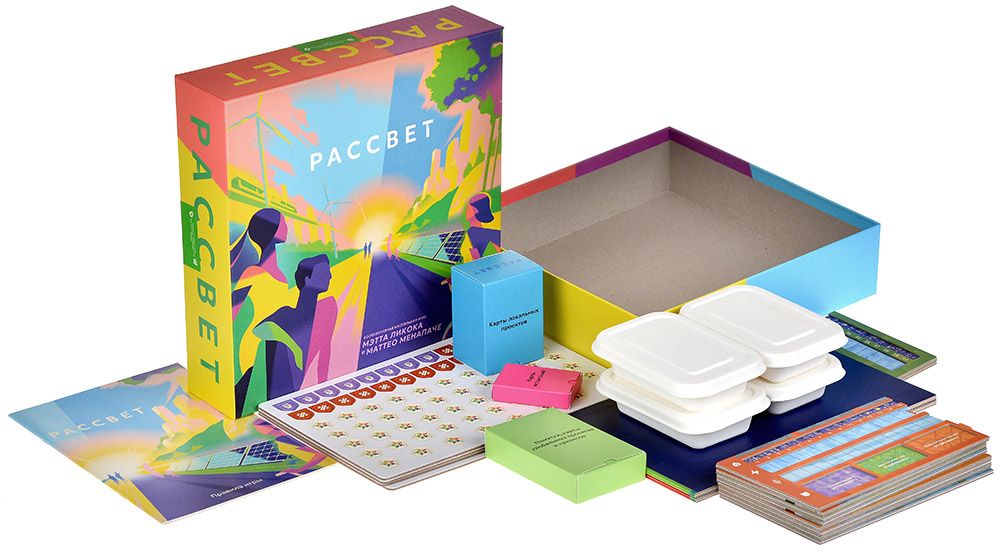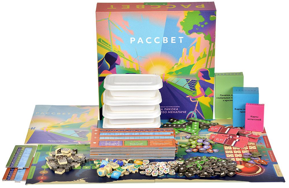 «Рассвет» выделяется экологически чистыми материалами: переработанная бумага, нетоксичные краски и продуманный органайзер для хранения. Богатые иллюстрации сотен карт погружают в детализированный мир современных климатических технологий и последствий потепления. Дизайн подчёркивает серьёзность темы, но сохраняет доступность: правила осваиваются за 10–15 минут, а соло‑режим позволяет одному игроку проверить силы против автоматизированных кризисов.​​