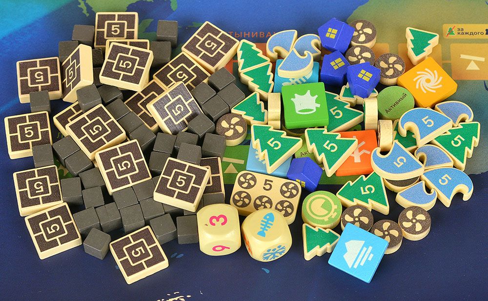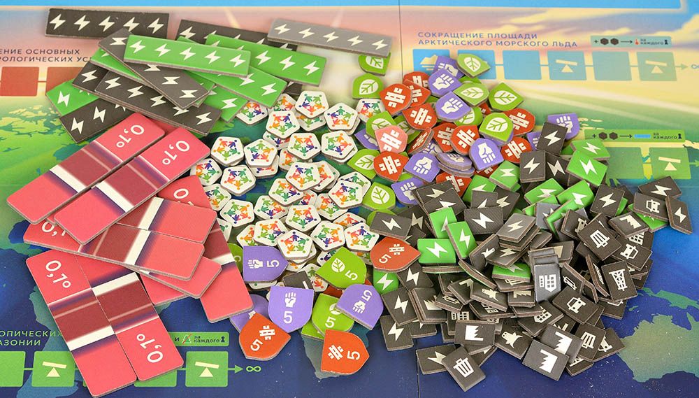 Ресурсы в игре представлены жетонами: углеродные блоки (которые нужно убирать), энергия, деньги и специальные фишки проектов. Игроки собирают их через базовые действия (производство, торговля, исследования) и тратят на амбициозные инициативы. Два кубика используются для случайных событий или генерации ресурсов, добавляя лёгкую вариативность без чрезмерной случайности.​​