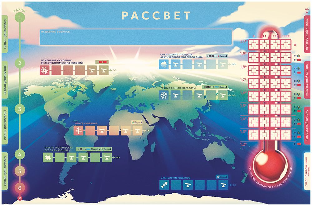 «Рассвет» — кооперативная стратегическая игра от Мэтта Ликока, создателя легендарной «Пандемии», в которой игроки объединяют усилия ведущих мировых держав, чтобы предотвратить климатическую катастрофу. Над Землёй нависла угроза глобального потепления, и только совместными действиями Китая, Европы, США или развивающихся стран можно разработать технологии, сократить выбросы углерода и справиться с кризисами вроде штормов, засух и инфраструктурных сбоев.​​