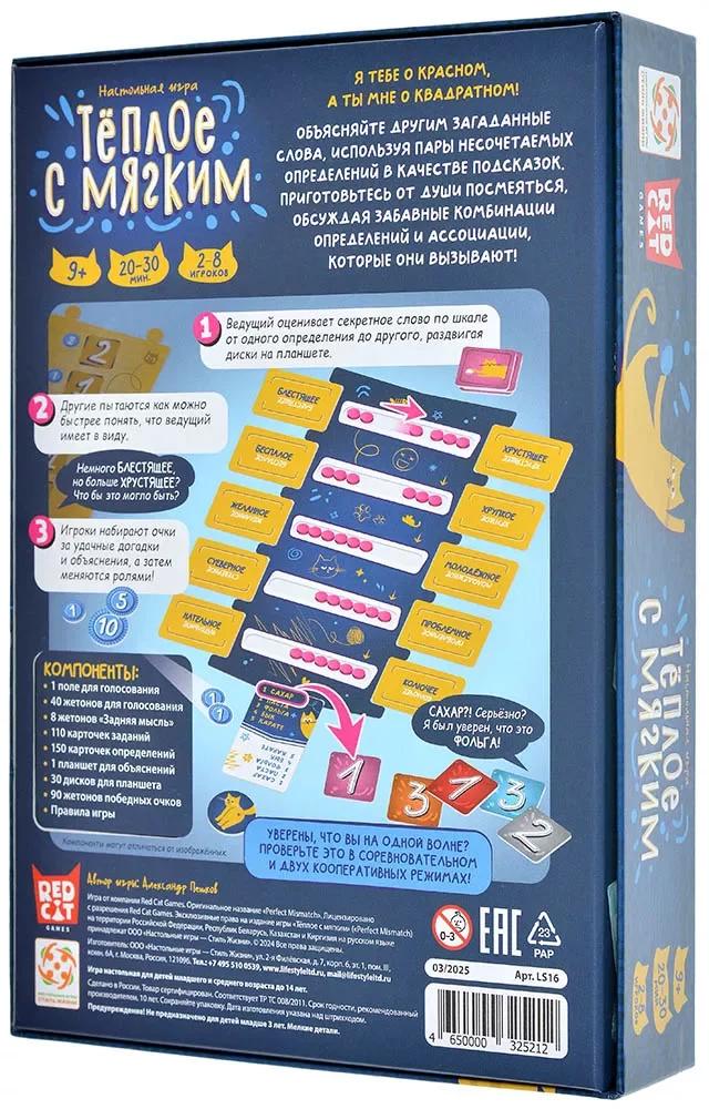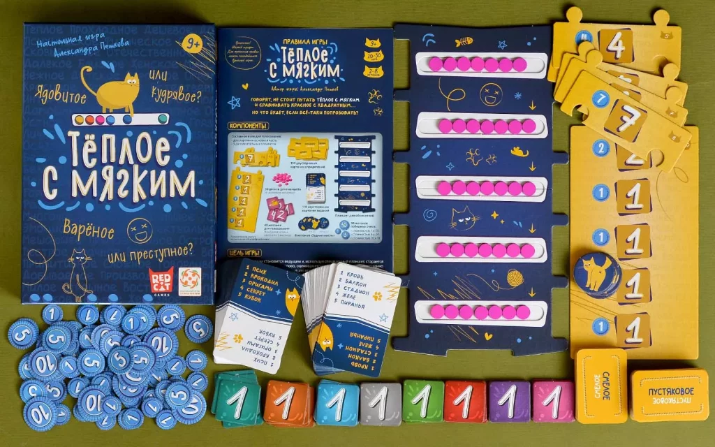 Ключевая фишка «Тёплого с мягким» – абсурдные и неожиданные пары определений. На картах встречаются прилагательные вроде «скользкое», «пушистое», «квадратное», «немыслимое» и множество других, которые в жизни редко оказываются рядом, но в игре вынуждают искать нестандартные связи. Чем оригинальнее ведущий интерпретирует шкалы, тем интереснее раунд, а смешные провалы, когда все трактуют диски по‑своему, становятся не менее запоминающимися, чем удачные догадки.
