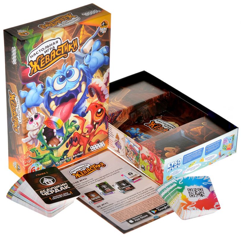 «Жевастики» рассчитаны на 2–4 игроков от 6 лет, а одна партия занимает около 20 минут. Компактная коробка и яркие иллюстрации делают игру удобной в поездках, а сочетание карт и мобильного приложения помогает заинтересовать детей цифровым, но при этом познавательным форматом.