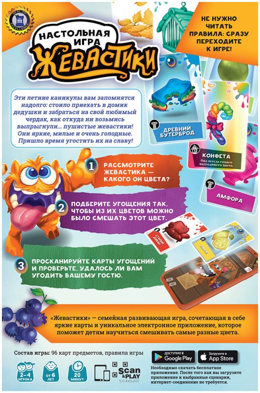 Главная задача игроков – накормить эту компанию существ идеальными угощениями, подбирая карты так, чтобы при смешении их цветов получить оттенок, максимально похожий на цвет шерстки очередного гостя. Для этого используется уникальное бесплатное приложение: оно сканирует карты предметов и «замешивает» цвета, показывая, довольны ли жевастики своим обедом.​